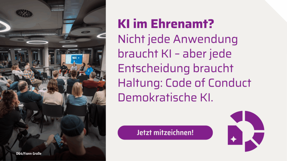 D64, das Zentrum für digitalen Fortschritt, hat den Code of Conduct in einem seit April 2024 laufenden partizipativen Prozess gemeinsam mit uns beteiligten Organisationen koordiniert und erarbeitet. Im Zentrum stehen acht gleichberechtigte Grundprinzipien: Abwägung der Nutzung, Menschenzentrierung, Transparenz, Teilhabe und Partizipation, diskriminierungskritische Haltung, Verantwortung und Verantwortlichkeit, Kompetenzen sowie ökologische Nachhaltigkeit. Die Selbstverpflichtung richtet sich explizit an gemeinwohlorientierte Organisationen und bietet ihnen einen praktischen Orientierungsrahmen; unabhängig davon, ob sie eigene KI-Systeme entwickeln, bestehende Anwendungen nutzen oder bewusst auf KI verzichten.
